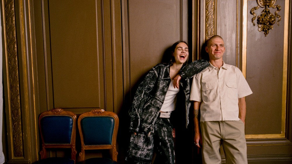 To give the utilitarian workwear-inspired range a contemporary and cultural touch, a cheeky campaign was also shot on film by Paris-based Spanish photographer Pablo Escudero at the Paris restaurant Le Train Bleu, in which a couple sits down for a formal dinner but only orders fries with a waiter pouring ketchup like fine wine.